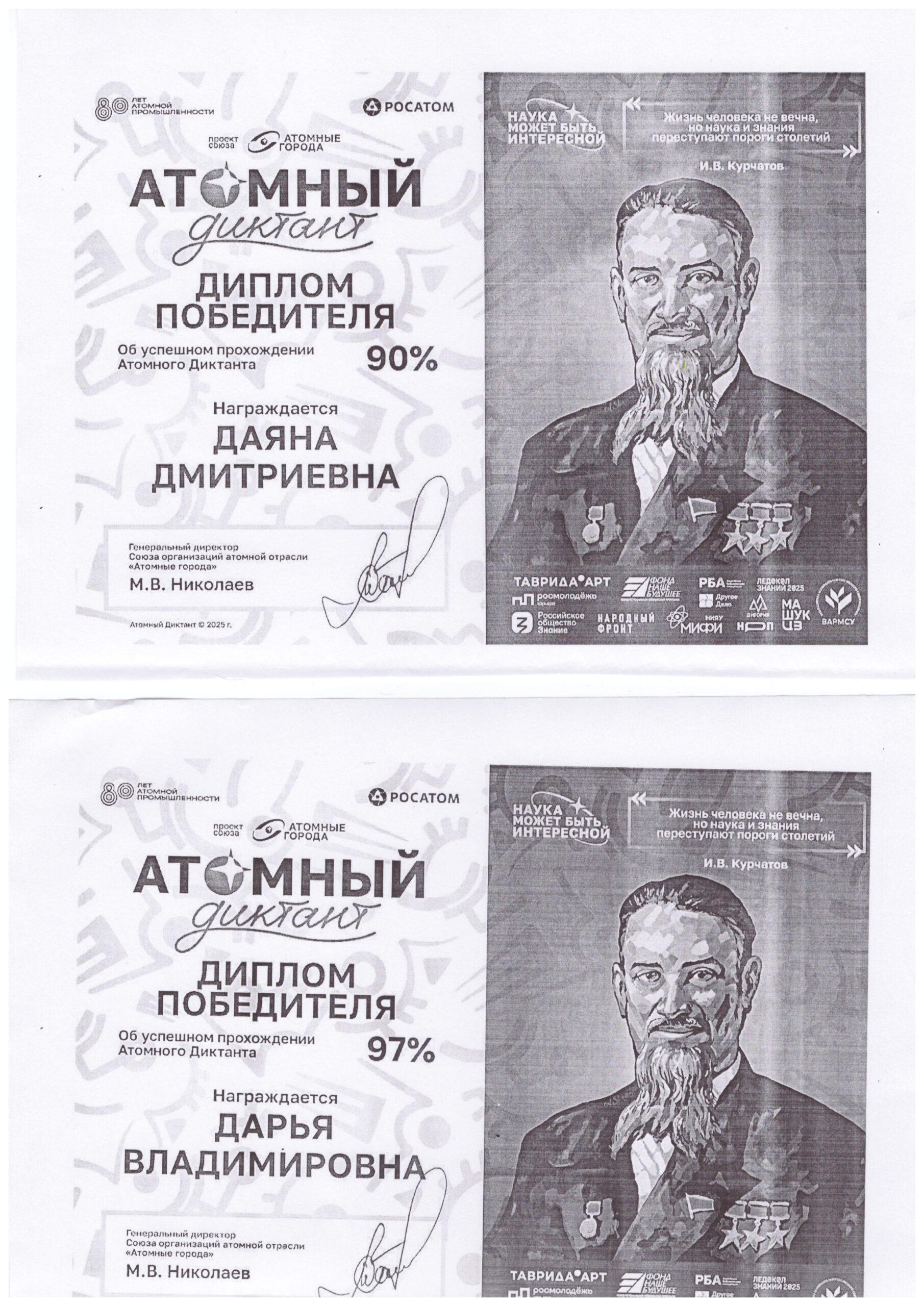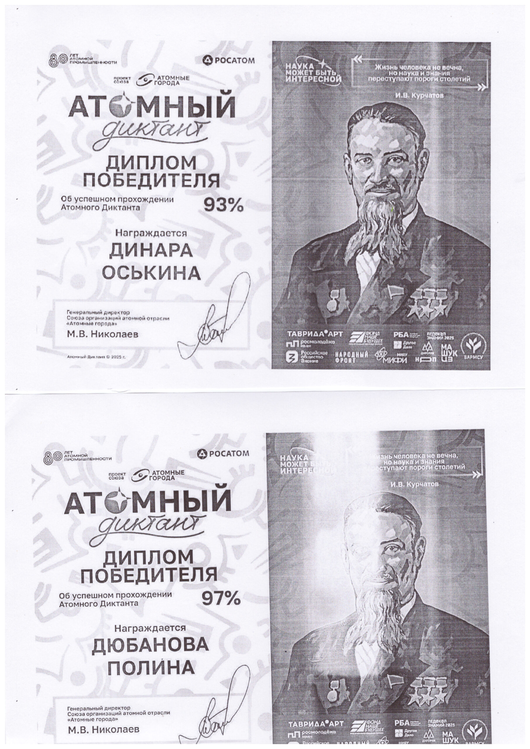 С 1 по 14 сентября 2025 года состоялся пятый юбилейный «Атомный диктант» — масштабный просветительский проект, организованная Союзом «Атомные города» при поддержке Госкорпорации «Росатом». Проект направлен на популяризацию знаний об атомной отрасли, включая вопросы энергетики, экологии, безопасности и истории атомной промышленности. В ходе диктанта школьники отвечали на вопросы по истории развития атомных технологий, безопасности использования ядерных материалов и перспективах применения атомной энергии. Учащиеся узнали много нового и интересного из истории развития атомной энергетики в Советском Союзе и Российской Федерации.