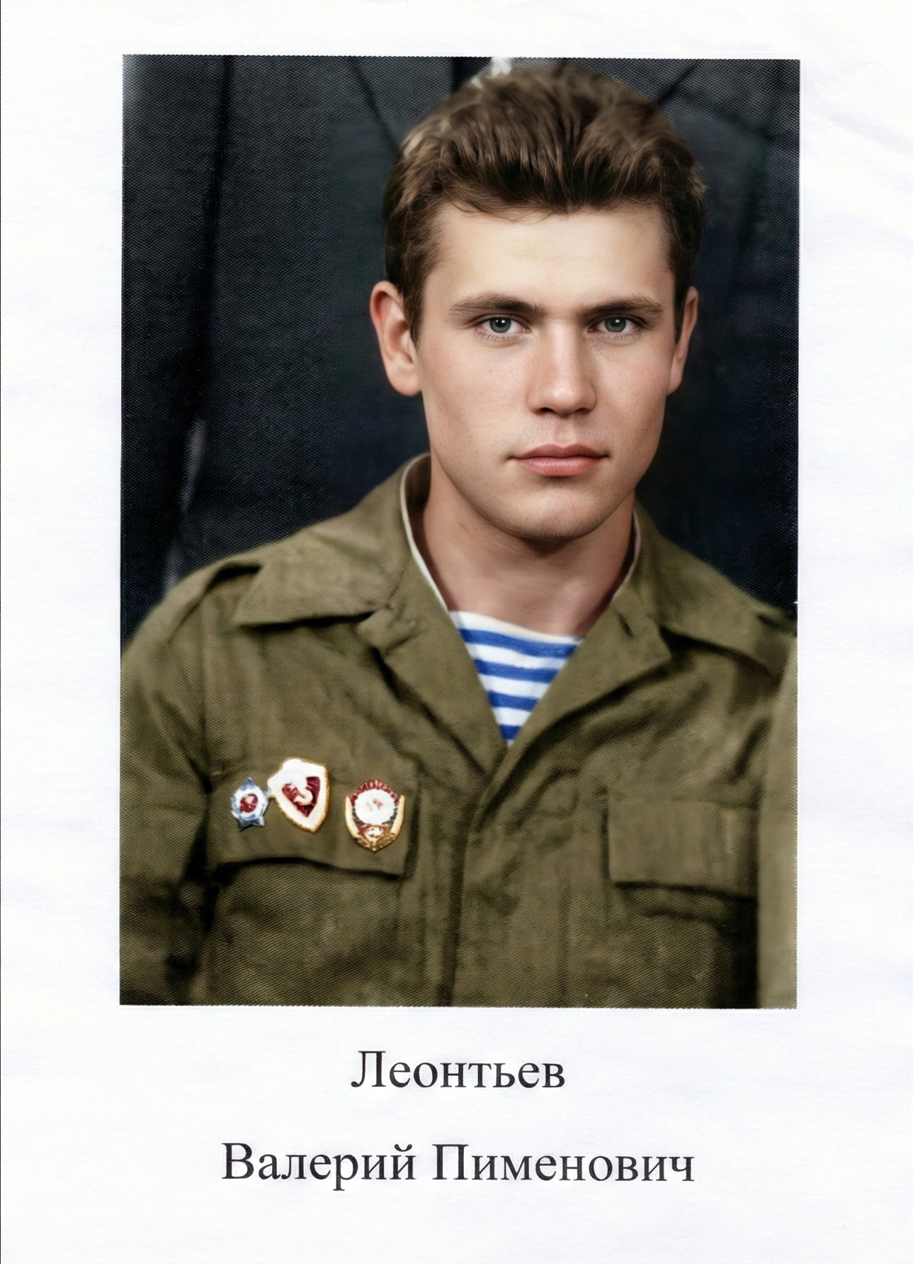Леонтьев Валерий Пименович. Родился 24 июля 1967г. в деревне Сирикли, Ибресиинский район, республики Чувашия. С 1 по 4-ый класс учился в деревне Сирикли, а с 5 по 8-ой класс в Ново-Чувашее. Школу закончил в 1984 г. Затем поступил в СПТУ – 13 Самарской области, Алексеевского район, поселка Авангард. До армии успел поработать в Ульяновской области на заводе. Весной этого года учился в школе ДОСАФ на водителя в г. Канош. Призвался в армию 19 октября 1985 г. Служил курсантом в республике Туркмения г. Кушка, в/ч 57087, там же принял присягу 8 декабря 1985 г. 2 февраля 1986 г. 602 батальон 3 рота пересекли границу Афганистан. В Афганистане служил водителем КАМАЗа, на котором воинская рота, перевозила снаряды. Демобилизовался 26 января 1988.